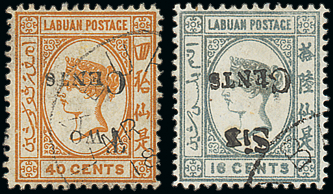 2c. on 40c. ochre and 6c. on 16c. grey, both variety surcharge inverted, fine used. B.P.A. Certificate (1978) for 2c. on 40c. S.G. 49a, 50a, £850. Photo