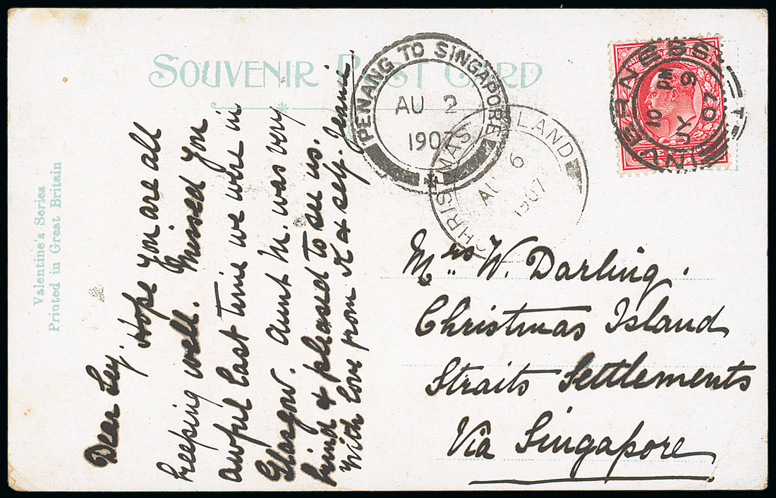 1907 (9 July) picture postcard from Inverness to Mrs. W. Darling at Christmas Island, bearing KE 1d., showing "penang to singapore" double-ring d.s. (2.8) partly overstruck by "christmas island" double-ring d.s. (Type D2) of 6 August. Photo