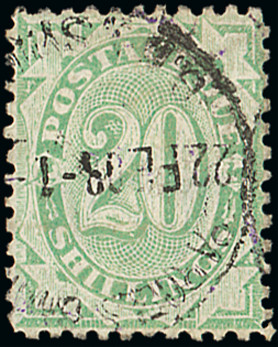 — 20/- dull green cancelled with large part 1908 Parcels c.d.s.; a few tiny purple marks and trace of a horizontal crease at top though a generally attractive example of this rare stamp. R.P.S. Certificate (1953). S.G. D44, £2,250. Photo
