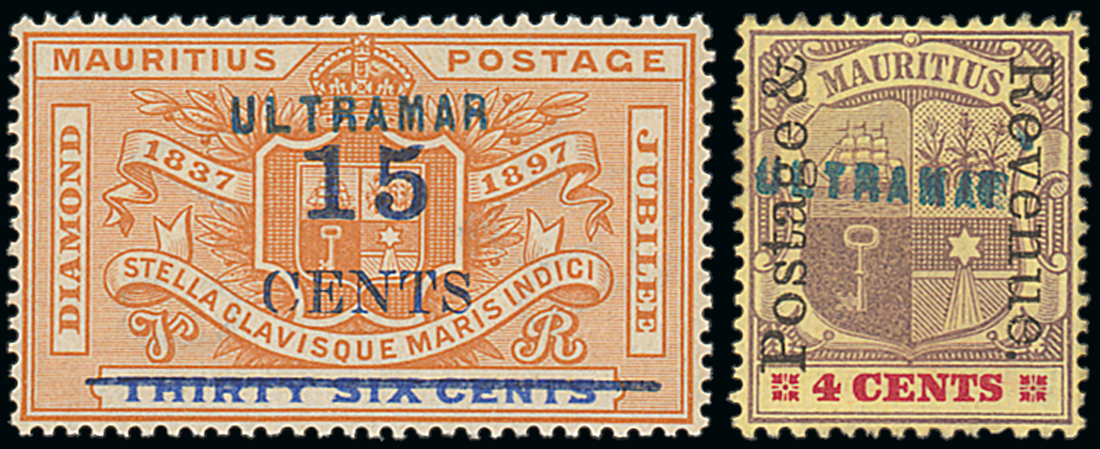 1899 (May) 15c. on 36c., 1900 4c. on 16c., 1902 12c. on 18c. and 1902 (July), 4c., 6c. (green washed out) and 25c., each handstamped "ultramar" in blue by Portuguese receiving authority, fine unused. Photo