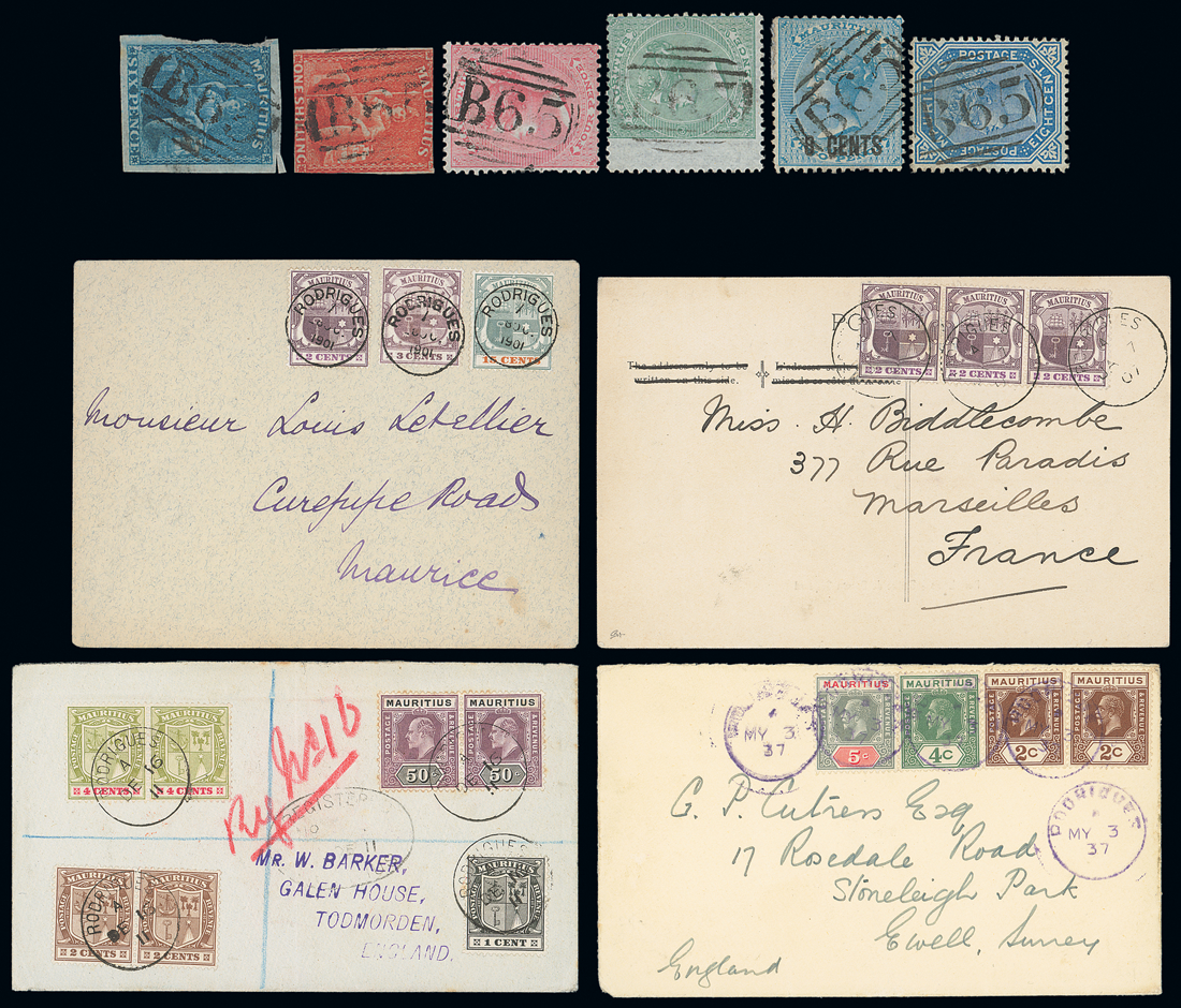A collection of cancellations on loose stamps/pieces (71) and covers (39); the loose stamps include "B65" (Type 2) on 1859 imperf 6d. blue (R.P.S. certificate, 1995) and 1/- vermilion (touched or cut-into on three sides), 1863-72 CC 1d., 4d. and 6d., and 1878 8c. on 2d., 13c. on 3d. and 17c. on 4d., "B65" (Type 1) on 1880 CC 8c., 1883-84 CA 4c. carmine, 4c. orange, 8c. and 16c., a range of c.d.s. on Arms values (22) to 25c.; the covers (1901-65) include 1901 (Oct.) envelope to Mauritius franked at 20c. and tied by superb Proud Type D3, 1907 (Jan. and May) picture postcards to Marseilles, franked at 6c. and 8c. (a 4c. does not belong) and cancelled by Type D4, 1911 (16 Dec.) "Barker" envelope registered to England, franked at $1.13 and cancelled by Type D4, 1919 (Apr.) envelope to Cape Colony, franked at 6c. and cancelled by Type D5, 1931 front registered to England, franked at 30c., cancelled by Type D4 and showing registration label, 1937 (3 May and 20 Aug.) envelopes to England, franked at 13c. and 7c., cancelled by Type D7 in violet, 1937 (Aug.) envelope to Port Louis franked at 5c. and cancelled by Type D7 in black, and 1947 (24 Oct.) envelope registered (marking deleted) to USA, franked at 2r.50 and cancelled by Type D8 in violet. A fine lot and a good basis on which to expand. Photo