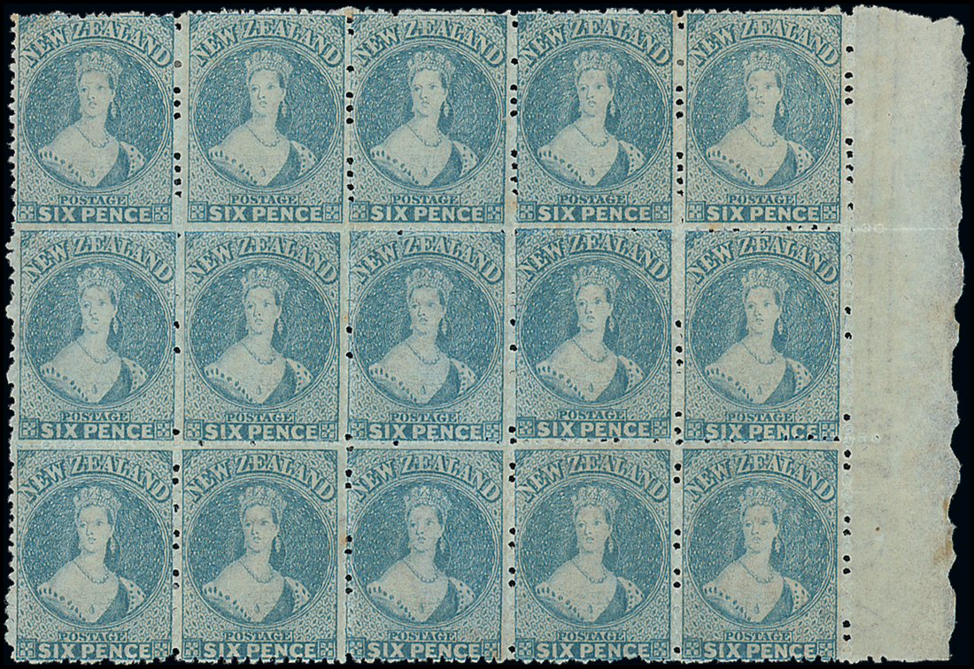 1871 watermark Large Star, perf 12½ 6d. pale blue, a marginal block of fifteen (5x3) from the right of the sheet and with watermark reversed, lovely fresh bright colour and with large part original gum. An outstanding multiple. B.P.A. Certificate (2009). S.G. 136. Photo