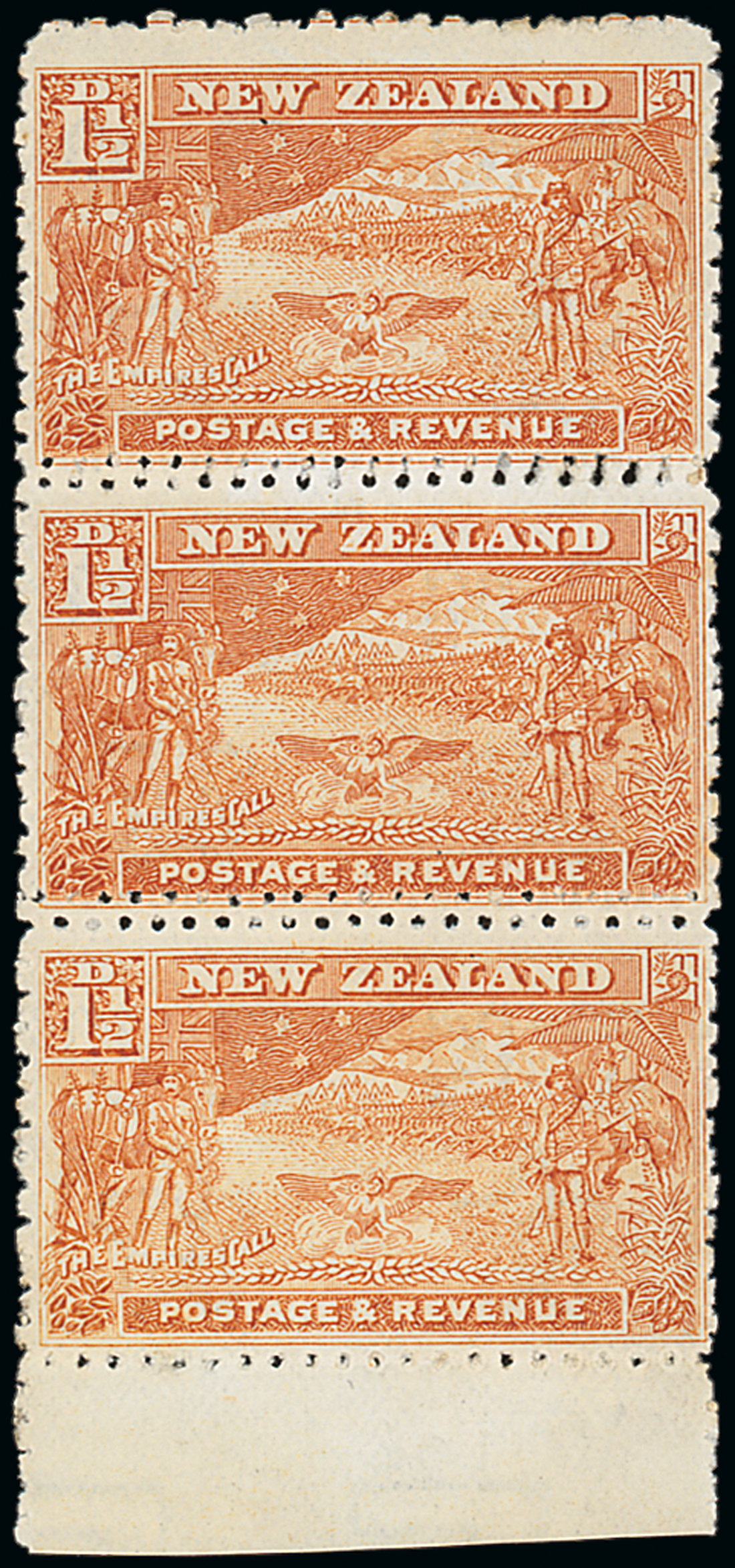 1900 1½d. chestnut vertical strip of three from the foot of the sheet, variety double perfs. between the top and middle and the middle and bottom stamps, fresh mint with the lower pair remaining unmounted. CP E4a(Z), $950. Photo