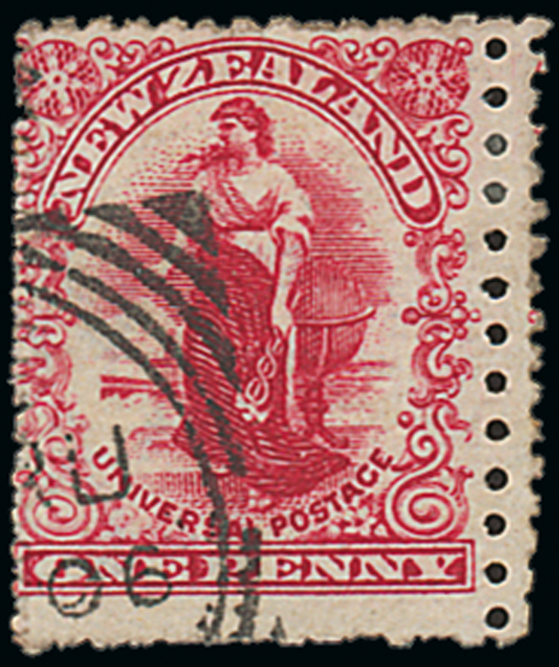 — mixed perfs., 1d. deep rose-carmine, small part Timaru 1906 squared-circle datestamp; sound. Scarce. CP G9e, $1,750; S.G. 355, £650. Photo