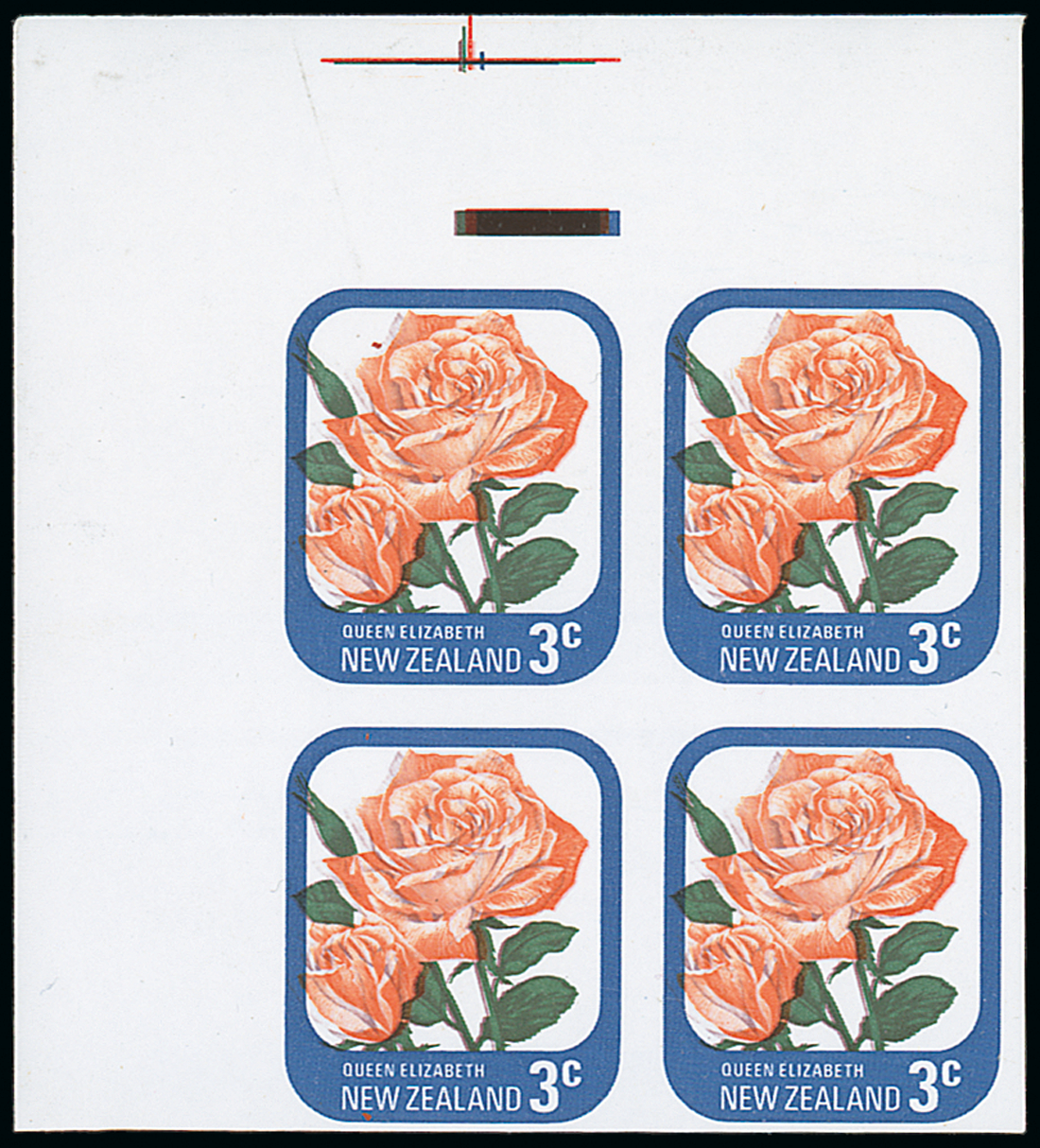 1975 3c. Queen Elizabeth Rose upper left corner block of four, variety imperforate, fine unmounted mint. CP PA3a(Z), $1,500. Photo