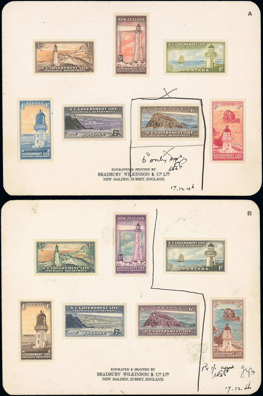 1947 Bradbury Wilkinson presentation cards (3), the first, marked "A" bearing imperf. ½d., 1d., 2d., 3d., 4d. and 1/- in unissued colours and the 6d. in the issued colours; the second, marked "B" bearing the same seven imperforate values though in different colours, the 1d. and 1/- in the issued colours; the third marked "2nd Proving/2/12/46" bearing imperforate ½d., 2d., 3d. and 4d. in the issued colours, each card dated "17.12.46", the stamps partially affixed to the cards on gummed watermarked paper, fine. S.G. L42-44, 46-69. Photo
