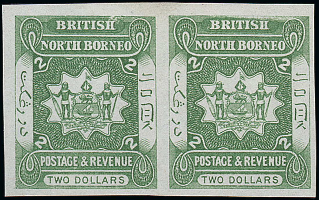 $2 dull green horizontal pair, variety imperforate, fresh unused without gum as usual. S.G. 48a, £650. Photo