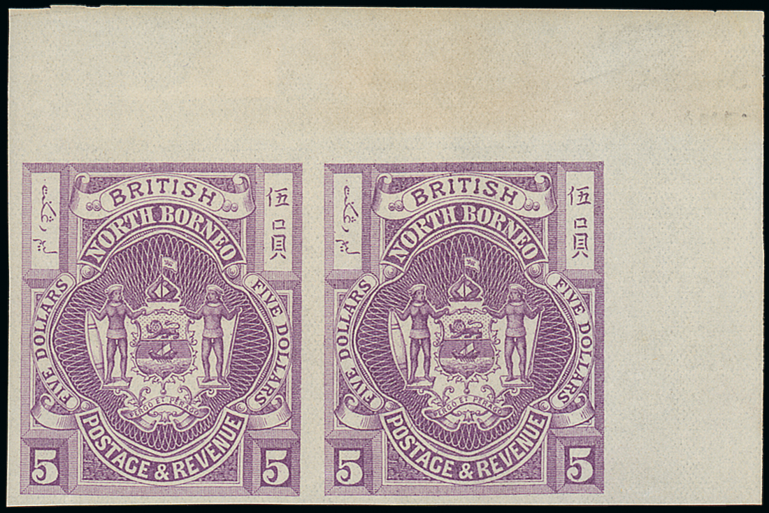 $5 bright purple upper right corner horizontal pair, variety imperforate, fresh mint with the stamps themselves unmounted. Scarce. S.G. 49a, £800. Photo