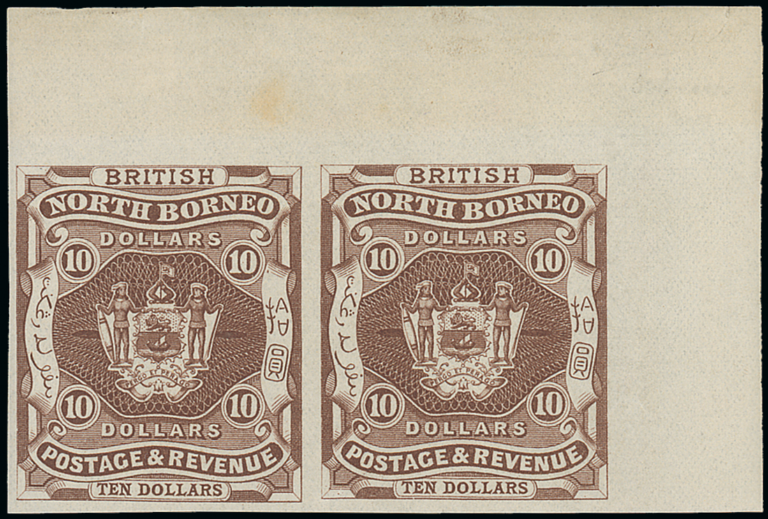 $10 brown upper right corner horizontal pair, variety imperforate, fresh mint with the stamps themselves unmounted. Scarce. S.G. 50a, £1,000. Photo