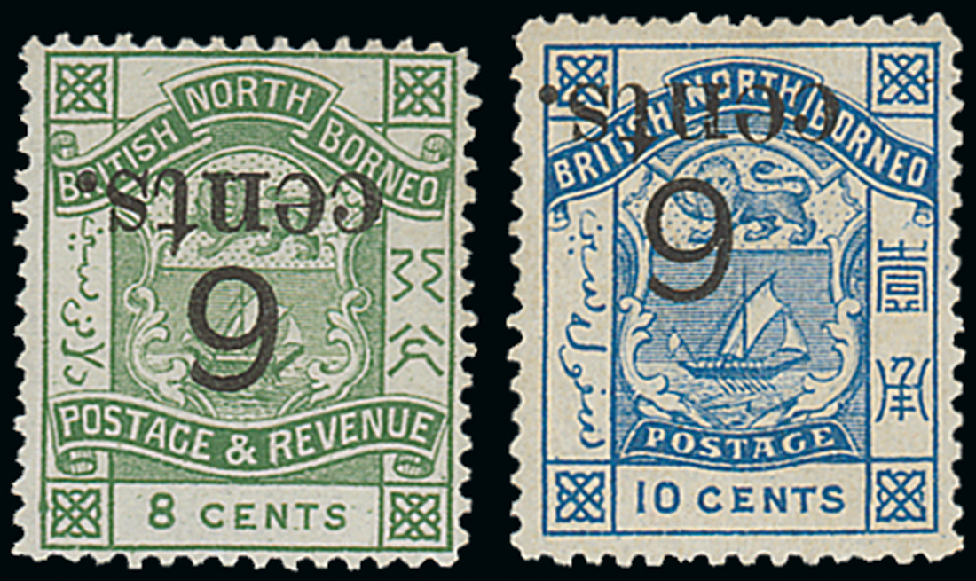1891-92 6c. on 1891 8c. and 6c. on 1886 10c., both variety surcharge inverted, fresh unused without gum. S.G. 55a, 56a, £750. Photo