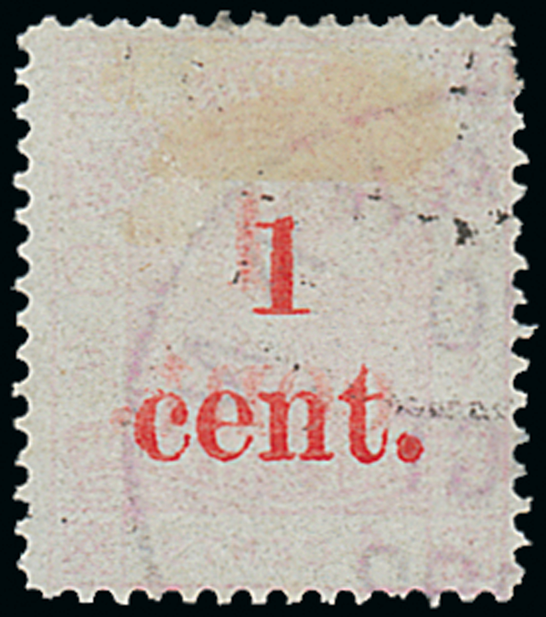 1892 1c. on 4c. rose-pink, variety surcharge on back and on front, neatly cancelled with Sandakan c.d.s.; small perf. defect at upper left, otherwise fine. Scarce. Holcombe Opinion (1989). S.G. 63b, £600. Photo