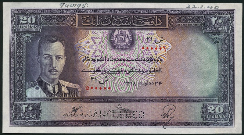 (†) Bank of Afghanistan, printer's archival specimen colour trial 5 Afghanis, SH 1318 (1939), serial run 000001 to 1000000, purple on pale blue and multicoloured underprint, King Muhammad Zahir at right, reverse mountain valley; also printer's archival specimen 20 Afghanis (2), SH1318 (1939), both serial runs 000001 to 500000, violet and multicoloured, King Muhammad Zahir at left, reverse mountain scenery, all perforated CANCELLED