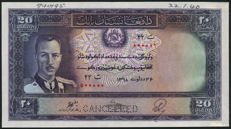 (†) Bank of Afghanistan, printer's archival specimen 20 Afghanis (2), SH1318 (1939), both serial runs 000001 to 500000, violet and multicoloured, King Muhammad Zahir at left, reverse mountain scenery; also obverse stage proofs (2) for 20 Afghanis, one with green, orange and purple underprint, the other with green, purple and violet underprint, both showing guilloche at upper centre and underprint only, the archival specimens both perforated CANCELLED