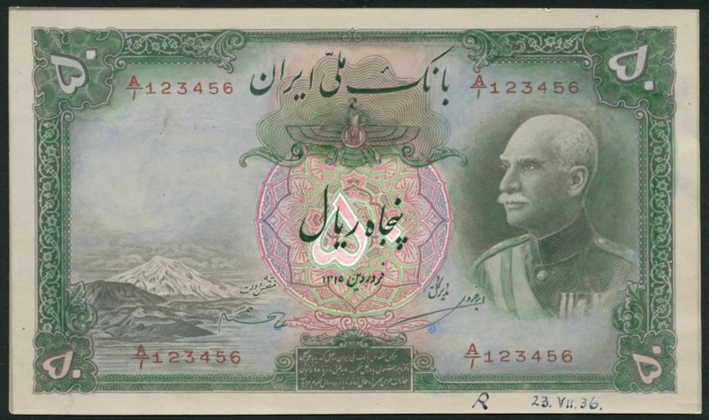 (†) Bank Melli Iran, black and white hand coloured composite obverse photographic proof on card for 50 Rials, AH1315 (1936), Western serial numbers A/1 123456, portrait of Shah Reza at right, Mount Damavand at lower left
