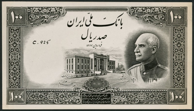 (†) Bank Melli Iran, black and white obverse and reverse photographic proofs on card for 100 Rials, AH1317 (1938), no serial numbers, portrait of Shah Reza at left, Bank Melli building at centre, reverse steamship and sailing boat, Persian text