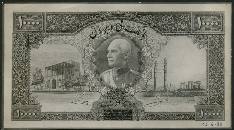 (†) Bank Melli Iran, black and white obverse and reverse photographic proofs on card for 10,000 Rials, AH1317 (1937), no serial numbers, portrait of Shah Reza at centre building at left, minarets and ruins, reverse pillar at left and right, bridge over river, French text