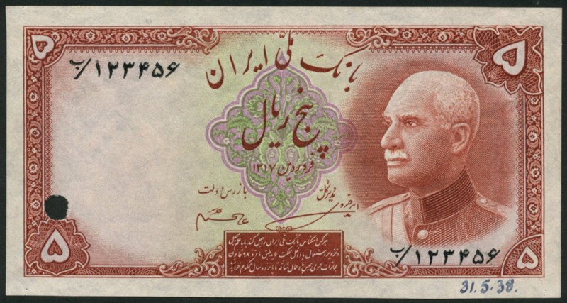 (†) Bank Melli Iran, specimen 5 Rials (2), AH1317 (1938), Persian zero serial numbers and Persian serial number 123456, both red-brown on multicoloured underprint, portrait of Shah Reza at right, reverse tomb of Daniel at Susa, Persian text, one copy one punch hole, the other overprinted in black with one specimen De La Rue oval on obverse