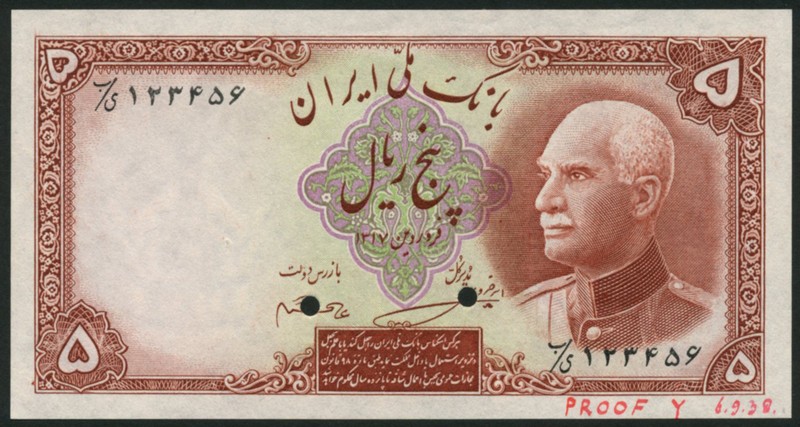 (†) Bank Melli Iran, specimen 5 Rials, AH1317 (1938), Persian zero serial numbers; also specimen proof 5 Rials (2), both Persian serial number 123456, all red-brown on multicoloured underprint, portrait of Shah Reza at right, reverse tomb of Daniel at Susa, Persian text, two copies two punch holes, one copy overprinted in black with one specimen De La Rue oval on obverse