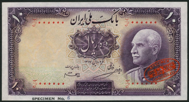 (†) Bank Melli Iran, specimen 10 Rials (2), AH1317 (1938), Persian serial numbers 000000 and 123456, both purple on multicoloured underprint, portrait of Shah Reza at right, reverse mountain scenery, Persian text, one copy overprinted in red with one specimen De La Rue overprint on obverse