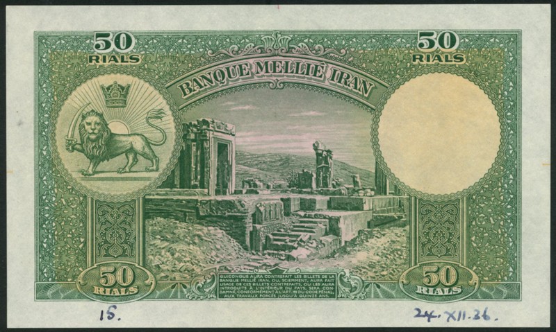 (†) Bank Melli Iran, specimen reverse stage proof 50 Rials , ND (1936), green on multicoloured underprint, arms at upper left, ruins at centre, French text