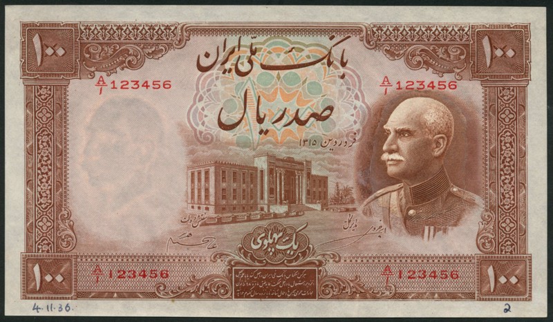 (†) Bank Melli Iran, specimen 100 Rials, AH1315 (1936), Western serial number A/1 123456, brown on multicoloured underprint, portrait of Shah Reza at right, Bank Melli building at centre, reverse steamship and sailing boat, French text