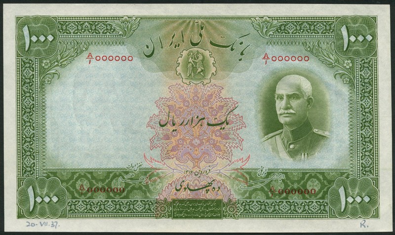 (†) Bank Melli Iran, specimen 1000 Rials, AH1316 (1937), Western serial number A/1 000000, green on multicoloured underprint, facing portrait of Shah Reza at right, reverse mountain scenery, French text