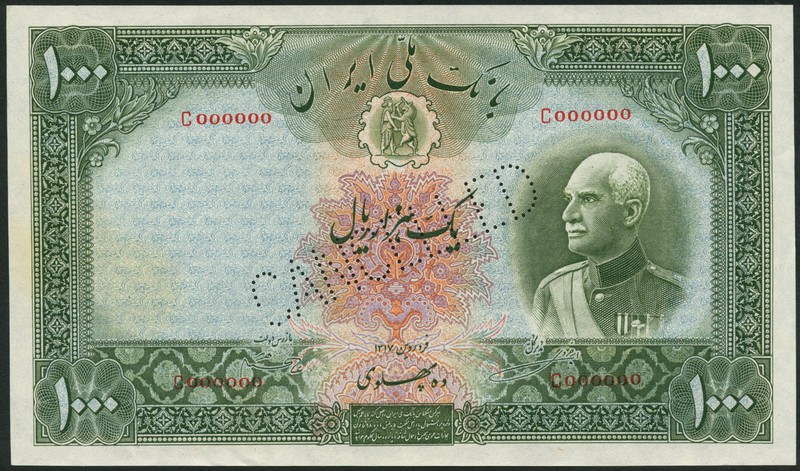 (†) Bank Melli Iran, specimen 1000 Rials, AH1317 (1938), Western red serial number C000000, green on multicoloured underprint, three quarters profile portrait of Shah Reza at right, reverse mountain scenery, Persian text, perforated CANCELLED