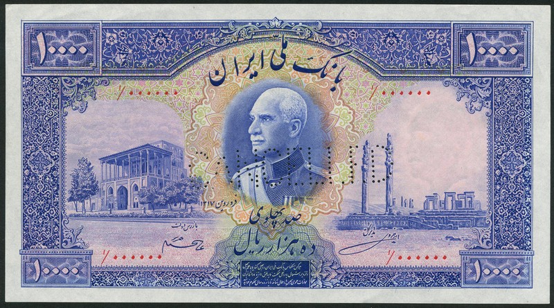 (†) Bank Melli Iran, specimen colour trial 10,000 Rials, AH1317 (1938), Persian red serial number 1/ 000000, blue on multicoloured underprint, portrait of Shah Reza at centre, building at left, minarets and ruins at right, reverse long river bridge, perforated CANCELLED