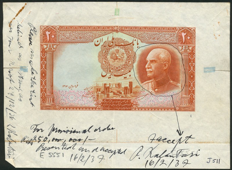 (†) Bank Melli Iran, obverse specimen proof for 20 Rials, AH 1316 (1937), orange, Shah Reza at right, ruins at Persepolis at lower centre