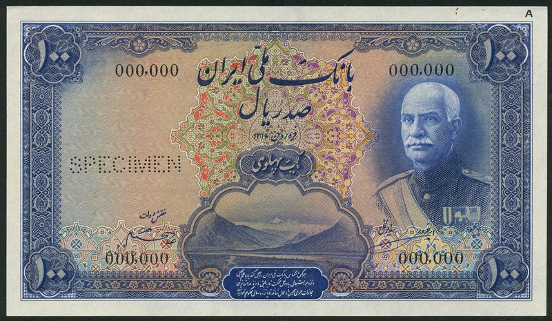 (†) Banque Mellie Iran, a colour trial 100 rials, AH 1316 (1937), serial number 000000, blue and multicoloured, Shah Reza facing at right, Mount Damavand low centre, value at centre and at each corner, reverse blue, pale orange and green, fortress at centre, Imperial arms at left, value at centre and at each corner