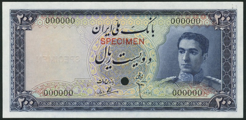(†) Bank Melli Iran, a group of specimen colour trials of the ND (1948-51) Issue, all second portrait of Shah Pahlavi in army uniform at right, comprising 20 Rials, orange and multicoloured; 100 Rials (2), purple and multicoloured; 200 Rials, deep blue and multicoloured, all one punch hole