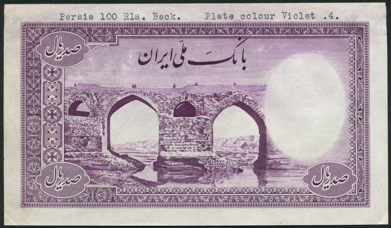 (†) Bank Melli Iran, specimen reverse stage proof 50 Rials, ND (1944), green, tomb of Cyrus the Great at Pasargarde; specimen reverse stage proof 100 Rials, ND (1944), bridge and dam at Dezful; also specimen reverse stage proof 200 Rials, ND (1951), dark green on orange underprint, railway viaduct showing colour bars