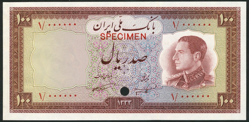 (†) Bank Melli Iran, a set of specimen colour trials of the SH1333 (1954) Issue, all zero serial numbers, all fourth portrait Shah Pahlavi at right, comprising 10 Rials, green on pink underprint; 20 Rials grey on pink and pale green underprint; 50 Rials, blue on green and purple underprint; 100 Rials, brown on yellow-green and purple underprint, overprinted SPECIMEN in red on obverse, one punch hole