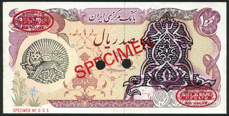 (†) Bank Melli Iran, specimen 20 Rials (4), ND (1974-79), signature 16 (2), signature 17 (2), brown on multicoloured underprint, all type VIII portrait of Shah Pahlavi at right, reverse , Amir Kabir dam; also specimen 100 Rials, ND (provisional issue), maroon on multicoloured underprint, type D overprint on portrait of Shah Pahlavi at right, lion and sun emblem overprint in watermark area at left, signature 18, reverse Pahlavi Museum , all overprinted SPECIMEN in red with two De La Rue specimen ovals on obverse and reverse, two punch holes