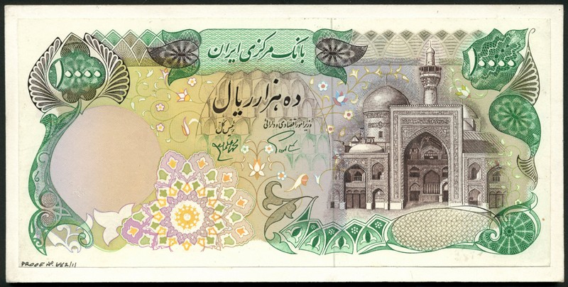(†) Bank Melli Iran, an obverse composite essay on board for a 10,000 Rials, ND (1981), no serial numbers, signature 19, dark green, olive-brown and dark brown on multicoloured underprint, Imam Reza Mosque at right