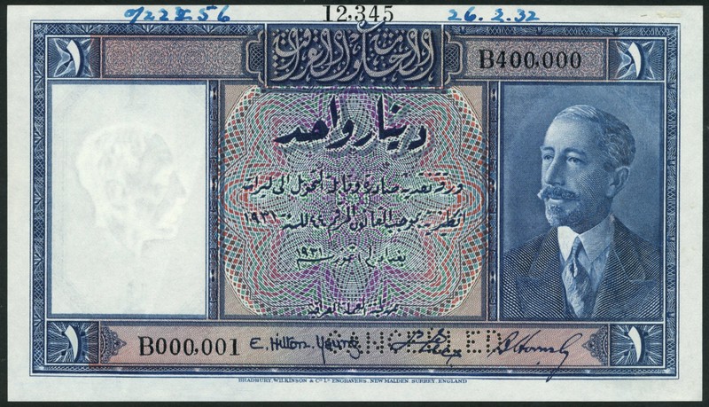 (†) Government of Iraq, printer's archival specimen 1 Dinar, 1 July 1931, serial number run B000,001 to B400,000, signature Sir Hilton Young, Ja'far Pasha al Askari and Sir Bertram Hornsby, blue on multicoloured underprint, portrait of King Faisal I at right, reverse blue, value at left, perforated CANCELLED
