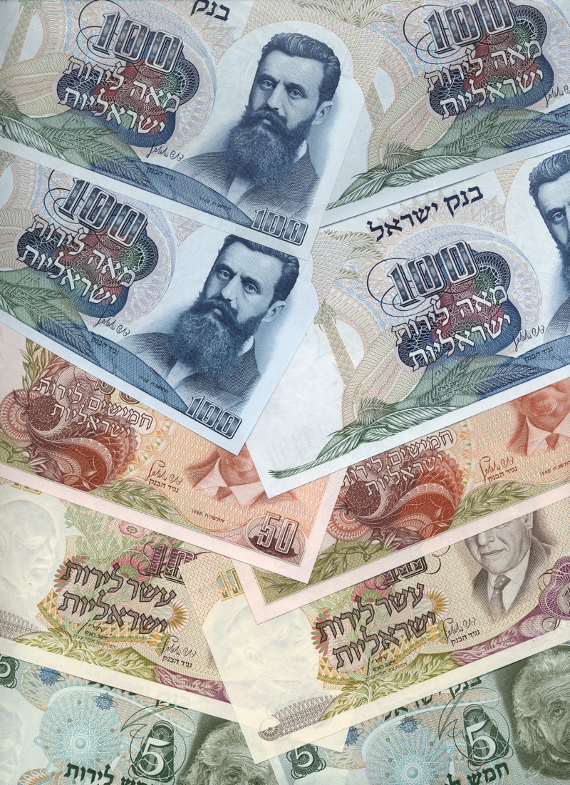 (x) Bank of Israel, complete 1968 Issue, 5 Lirot Albert Einstein at right, 10 Lirot Chaim Nahman Biaklik at right, 50 Lirot Chaim Weizmann at right, 100 Lirot Dr.Theodor Herzl at right