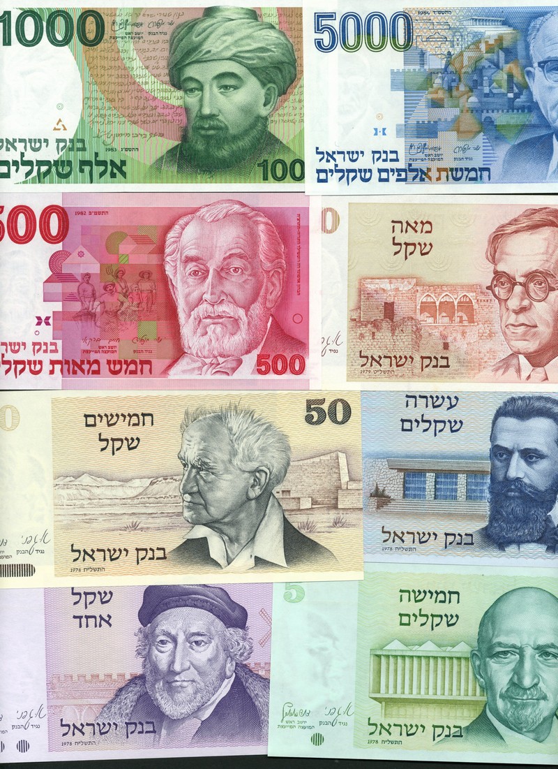 (x) Bank of Israel, complete 1978-84 Issue, 1 Sheqel purple on lilac underprint, 5 Sheqalim green on olive green underprint, 10 Sheqalim blue on brown underprint, 50 Sheqalim black and tan on brown underprint, 100 Sheqalim red on multicolour underprint, 500 Sheqalim red on multicolour, 1000 Sheqalim green on multicolour underprint, 5000 Sheqalim blue on multicolour underprint