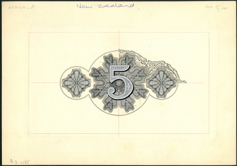 (†) Bank of New Zealand, a partially hand excecuted reverse essay for a 5 pound, ND (1894), black, white and blue, value at centre