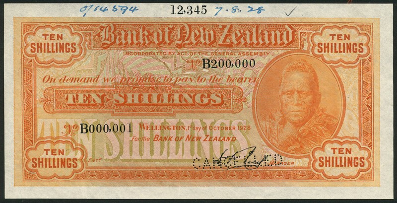 (†) Bank of New Zealand, printer's archival specimen 10 Shillings, Wellington, 1 October 1928, serial number run B000,001 to B200,000, signature D. F. Reid, orange on multicoloured underprint, portrait of Maori King Tawhiao at right, value in each corner, reverse two Maoris at left, arms at centre, lakeland scene at right, perforated CANCELLED