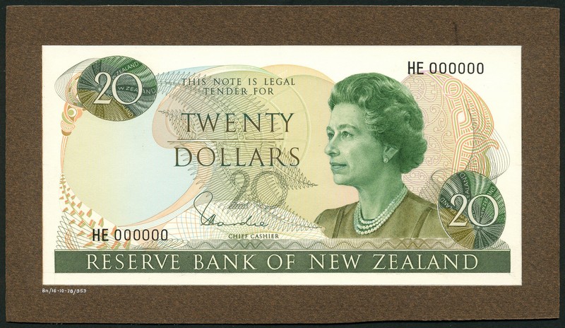 (†) Reserve Bank of New Zealand, partially hand excecuted obverse composite essay for a $20, ND (c. 1978), serial number HE000000, green and olive on multicoloured underprint, Elizabeth II at right, value at top left and low right, Hardie signature at low centre