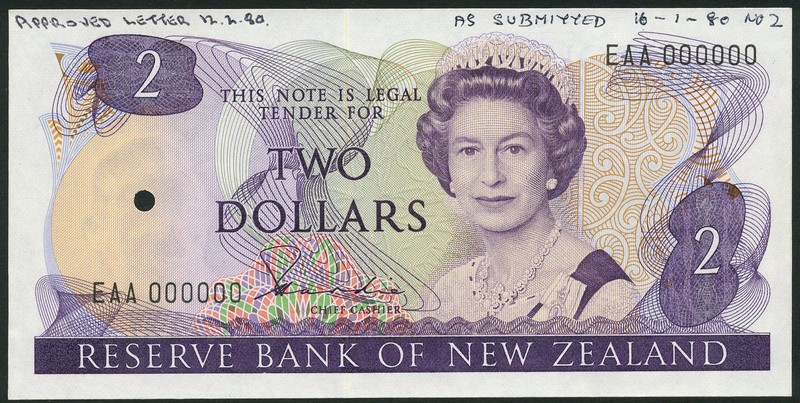 (†) Reserve Bank of New Zealand, specimen proof $1, ND (1980), serial number AAA 000000, dark brown on multicoloured underprint, mature portrait of Queen Elizabeth II at right, reverse clematis and pied fantail; specimen proof $2, ND (1980), serial number EAA 000000, purple on multicoloured underprint, mature portrait of Queen Elizabeth II at right, reverse mistletoe and rifleman, both signature H. R. Hardie, one punch hole