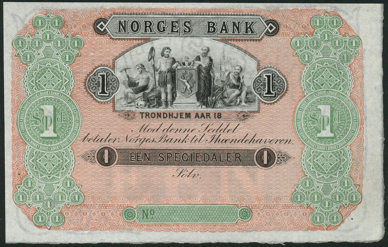 (†) Norges Bank, specimen 1 speciedaler, ND (1865-77), black on red and green underprint, white paper, four allegorical figures and crowned arms at centre