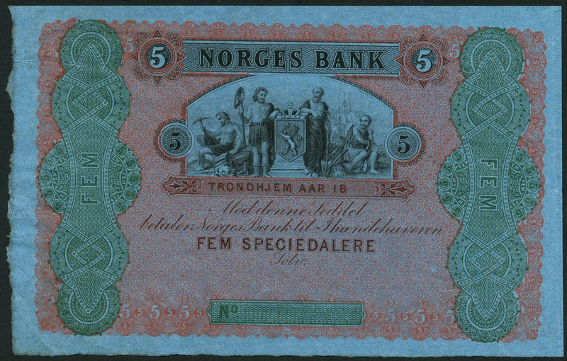 (†) Norges Bank, specimen 5 speciedaler, ND (1865-77), black on red and green underprint, blue paper, four allegorical figures and crowned arms at centre