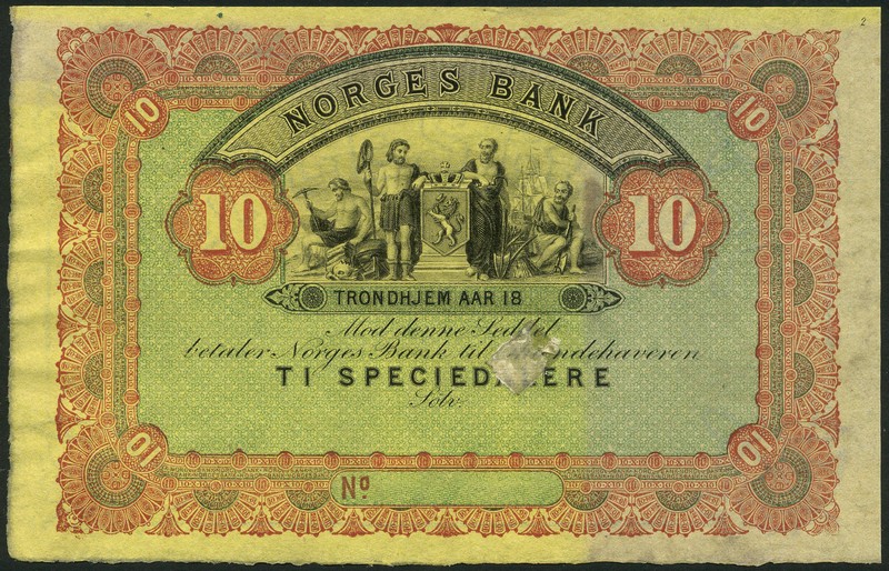 (†) Norges Bank, specimen 10 speciedaler, ND (1865-77), black on red and green underprint, yellow paper, four allegorical figures and crowned arms at centre