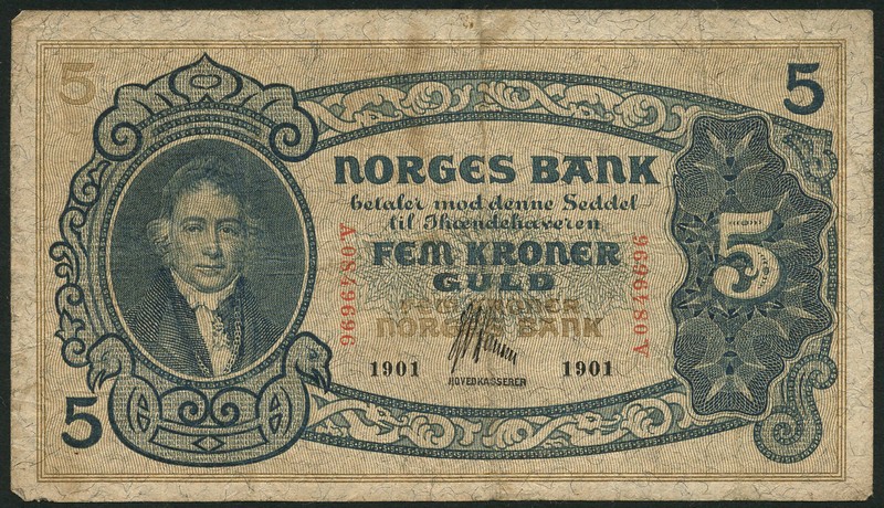 Norges Bank, 5 kroner, 1901, red prefix A, blue-green and tan, President Christie at left, value at right, Hansen signature