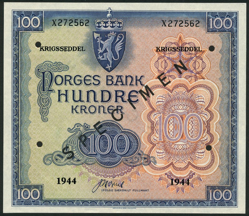 (x) Norges Bank, 100 kronur, unissued remainder, 1944, serial number X272562, blue on brightly multicoloured underprint, crowned arms at top centre, values at low centre, right centre and each corner, reverse orange, crown and values, four cancellation holes and black SPECIMEN overprint