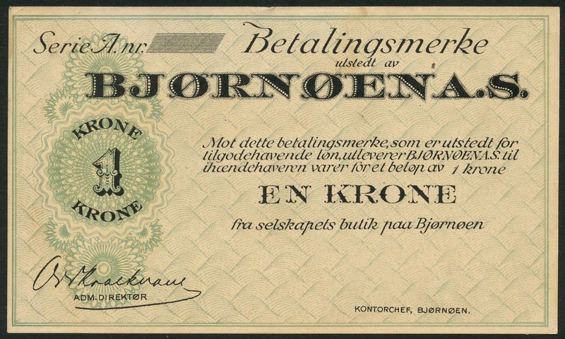 (x) Bjørn-Øen A.S. (Bear Island), unissued 1 krone, ND (c.1923-24), no serial numbers, black on green underprint, value at left, only one signature