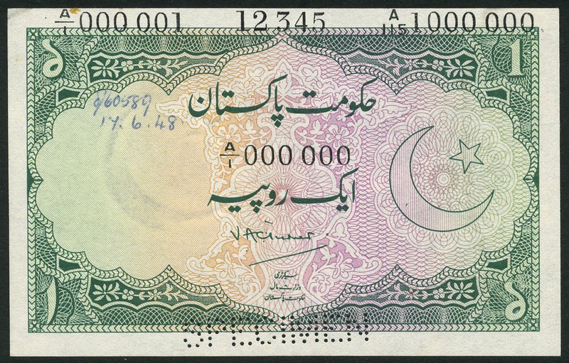 (†) Government of Pakistan, printers archival specimen 1 rupee, ND (1949), serial numbers A/1 000001 - A/115 1000000, green on multicolour underprint, cresent moon and star at right, value at each corner, reverse archway at left centre, perforated SPECIMEN, ink annotation in watermark area