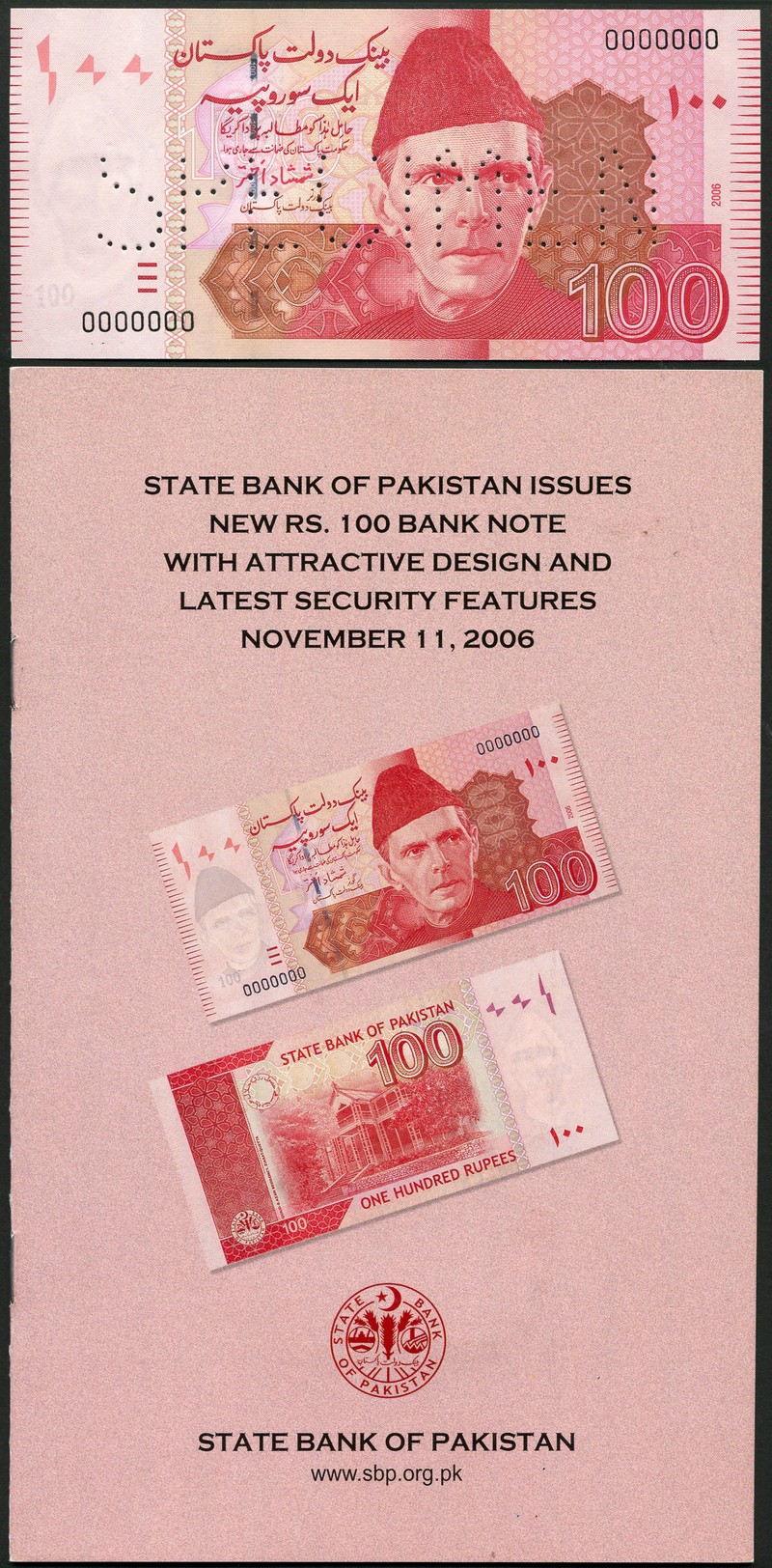 (x) State Bank of Pakistan, four presentation booklets, one for each denomination, containing the technical details of the issues and comprising specimen 5 rupees, 2008, olive green, specimen 50 rupees, 2009, purple, specimen 100 rupees, 2006, red and specimen 500 rupees, 2006, blue-green, all serial number 000000 and portrait of Mohammed Ali Jinnah at right, there is also an additional specimen 5 rupees dated 2009,